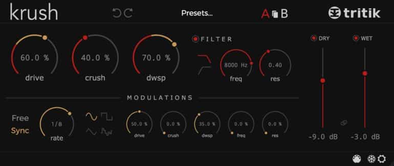 A modulation section allows a user to modulate any parameter. The sound palette produced by Krush is intended to range from dirty digital effects to crunchy modulated colors, with all bit-crushing effects in between.