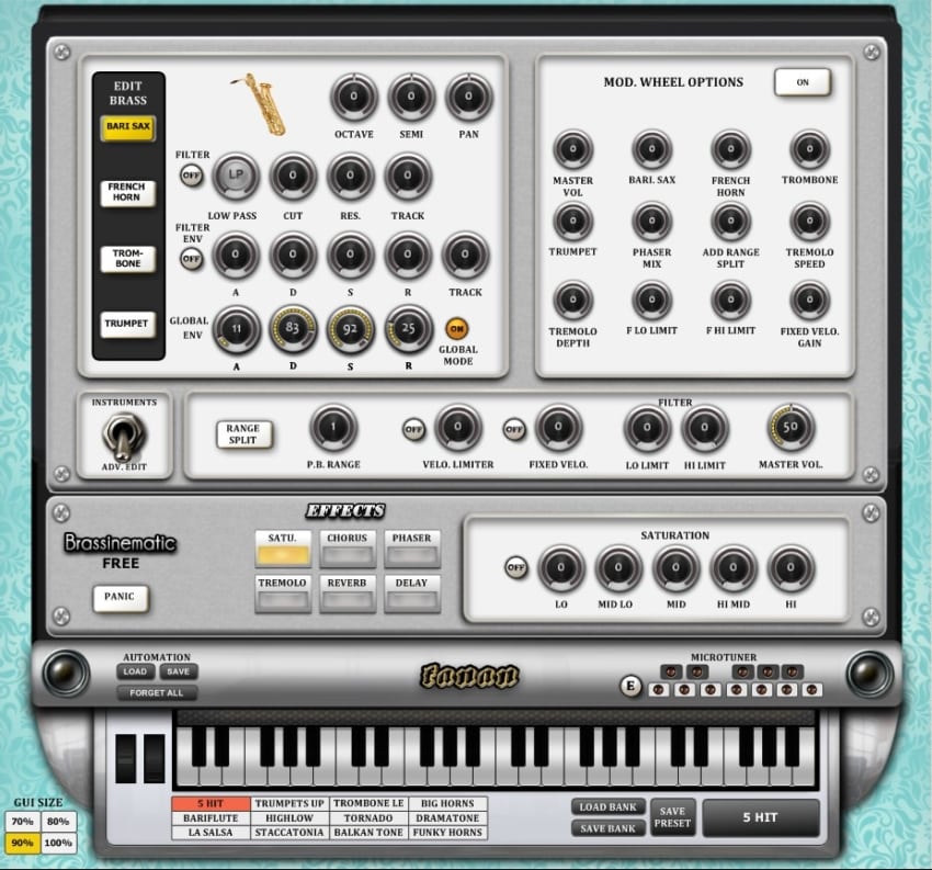 It has an easy-to-use and funky looking GUI, which contains 7 instruments. An alto, soprano, baritone, and tenor saxophone, trombone, trumpet, and trumpet ensemble provides you with nearly 7300 samples.