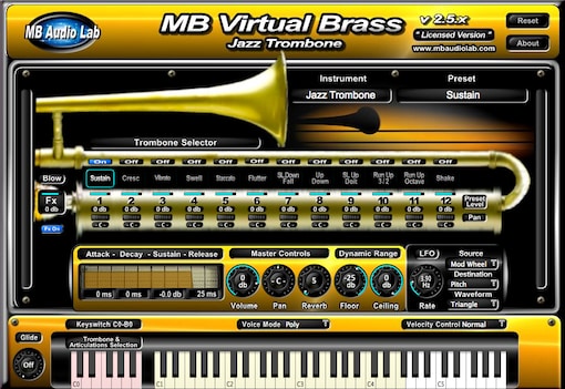 It gives you the ability to play 23 instruments including a flugelhorn, multiple saxophones, trumpets, tubas, trombones, French horns, and the ability to combine all of these for ensembles. It has a pleasantly simple GUI and contains built-in delay and flanger effects.