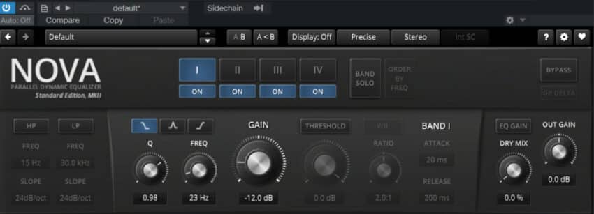 Nova is a parallel dynamic EQ that offers four bands which also include a fully-featured dynamic section each with threshold, ratio, attack, and release, essentially working as an EQ and multiband compressor all in one.