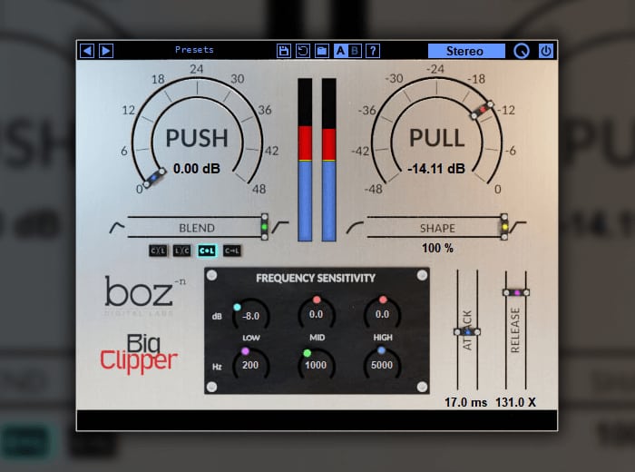 Its GUI has artsy graphics displaying its parameters: push and pull act as input and ceiling pots, blend lets you dial in a balance between normal limiting and clipping, and shape lets you decide how gentle or aggressive you want the clipping to be.