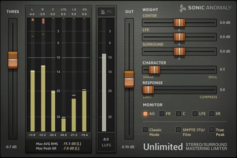 Unlimitedâs interface is sleek, with faders available to control all parameters. Itâs capable of processing in up to 5.1 surround sound, includes a LUFS meter, and has a mode designed specifically for film and television standards, so you can really squeeze your score âtil its peaks get sore.