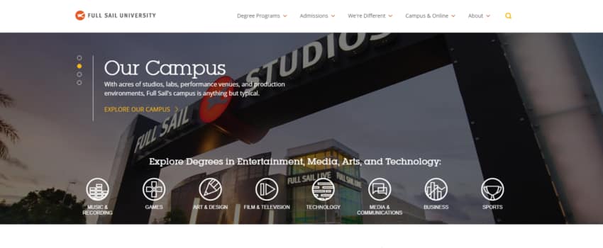 Offering associate’s, bachelor’s, and master’s degrees, Full Sail’s approach is centered on real-world industry experience, meaning that their programs are project-based work in professional environments and on professional software and hardware.
