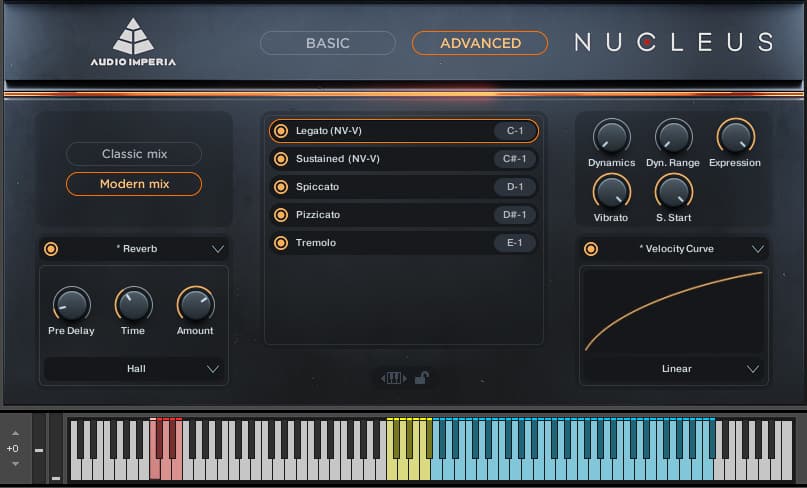You can choose between a couple different mic positions and it also features different articulations; different chord types, staccato and sustain unison, and more.