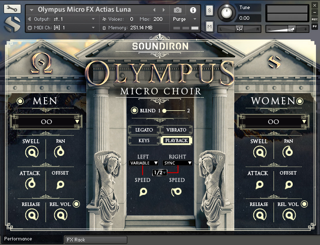 It features both Men’s and Women’s sections with editable key changes as well as sustains, staccato, and marcatos, with pp-ff dynamic layering and intelligent round-robin, as well as the Soundiron’s FX rack which allows you to tweak the sounds to your liking, just like Olympus Choir Elements.