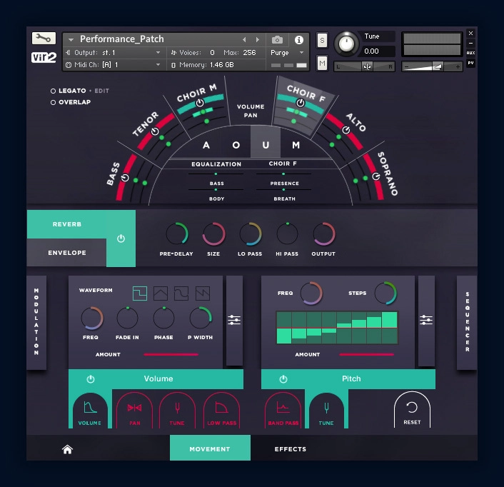 The Vowelmaster preset provides live sustain and staccato switching for any vowel for each section, with layer blending and stacking, dynamic shaping and total performance control.