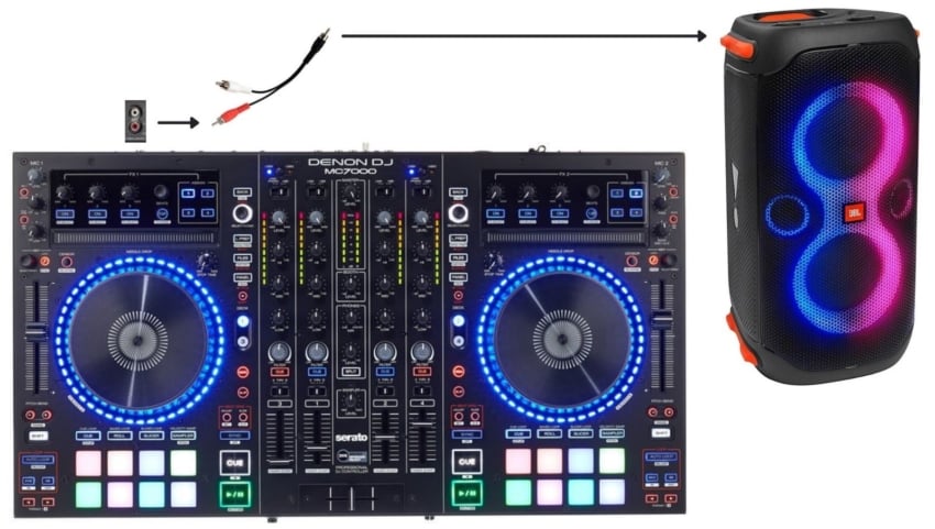 99% of DJ controllers have an RCA master output which you use to send audio to the speakers, and in this case, you can use an RCA-to-3.5mm jack cable to transmit that audio from the controller to the Bluetooth speakers.