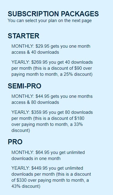 Only the Pro plan provides you with unlimited downloads. However, the starter and semi-pro plans only allow for 40- and 80 downloads a month respectively.