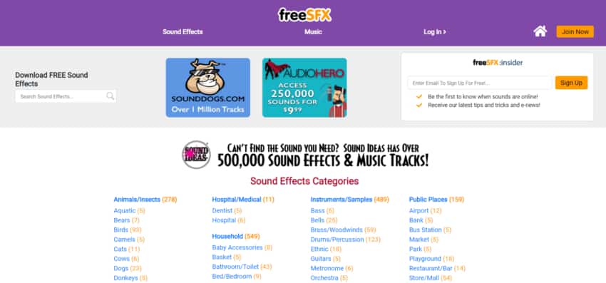 As soon as you open up PartnersInRhyme.com you’ll see why it’s on this list. It has a truly enormous selection of royalty-free sound effects and music that can be downloaded completely for free.