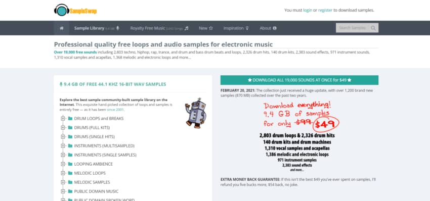 SampleSwap.org is one of the oldest websites on this list, curated 19,000 free sound effects and loops across 20 years. The sample library is also hand-picked, which gives it a sense of quality over quantity. Sure, it doesn’t have as many samples as freesound.org, but every sample found is high-quality and approved by the website. It does require users to register a free account in order to download, but samples can then be used without having to pay any royalties, completely for free.