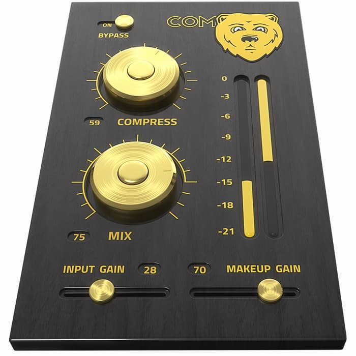 It comes with the typical compressor controls, such as Compress, Mix, Input Gain, Make-Up Gain, and Bypass. By adjusting the Compress knob, you increase the Parallel Compression that ComBear adds to the element from value 0 to 100.