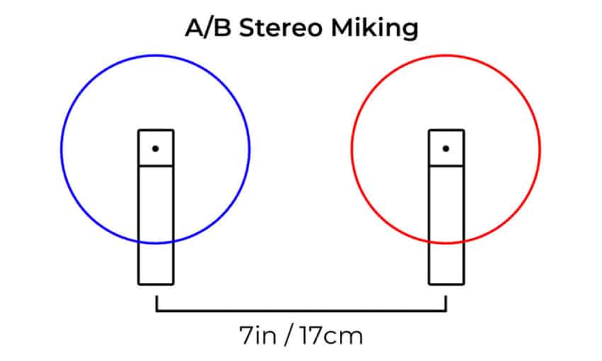 The A/B method, also known as “Spaced Pair”, involves two microphones positioned anywhere from 3 to 10 feet apart, meant to capture the same sound source.