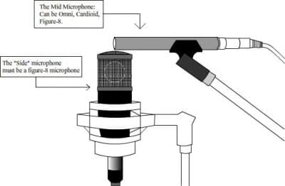 Mid/Side consists of using one cardioid and one bidirectional mic, or figure of 8 polar pattern, where the cardioid microphone is facing towards the sound source while the bidirectional mic is facing to the sides. Both microphones are generally stacked on top of each other to prevent phase issues.