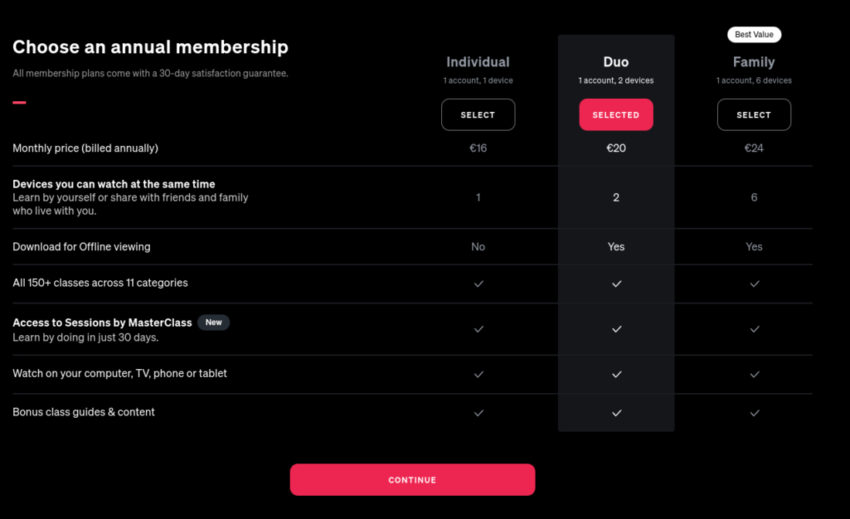 The prices are as follows: $15 for an individual plan, $20 for a Duo plan (1 account, 2 devices), and $23 for the Family plan (1 account and 6 devices), but the Individual plan doesn’t allow you to download the content whereas the other plans do.