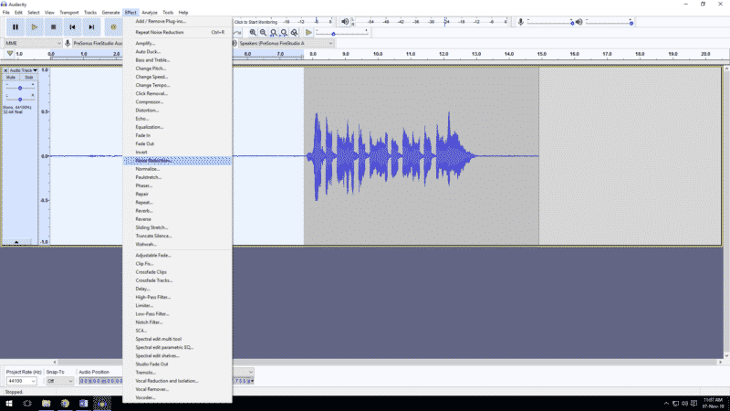 Select the track by clicking on the far left side of it, go back to Effects, click on Noise Reduction again and click “OK”.