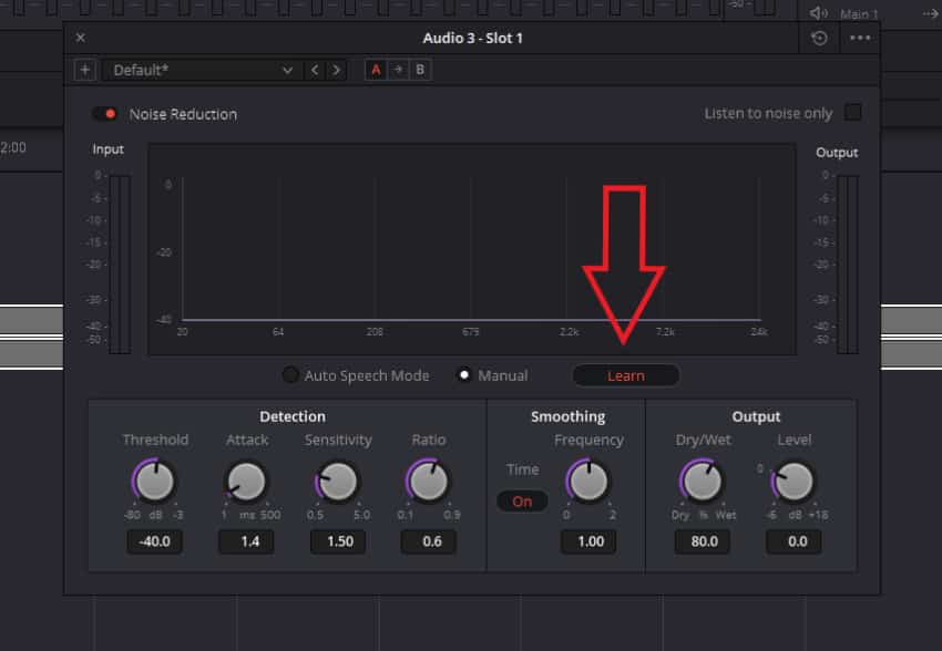 Note: Make sure to let the noise reduction software create a good noise profile by using the “learn” function on a section of the audio where only the noise that needs to be removed is present.