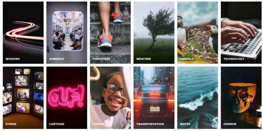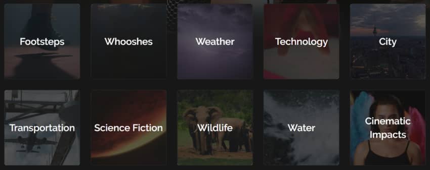 You can choose from sound effects such as Footsteps, Whooshes, etc. to Wildlife, Water, and many more.