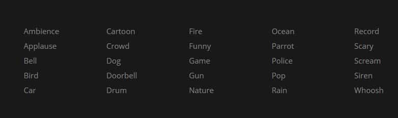 As far as sound effects go, you can choose from a huge variety; From Ambience, Airport, etc., to Comedy, Electronic, Computer Sounds, and more.