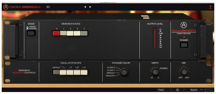 Its interface is sleek and minimalistic. Its features include 4 modes, a mono/stereo switch, a waveshape selector, and a dynamic colour dial. With so many effects out there offering an exaggerated or cold sounding clone of the Dimension-D, this plug-in truly captures the BBD analog character of the classic Roland chorus.