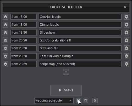 The Event scheduler let’s you line up a series of commands such as playing songs in a playlist, play videos after that playlist, or your DJ name, etc., and this is all automated.