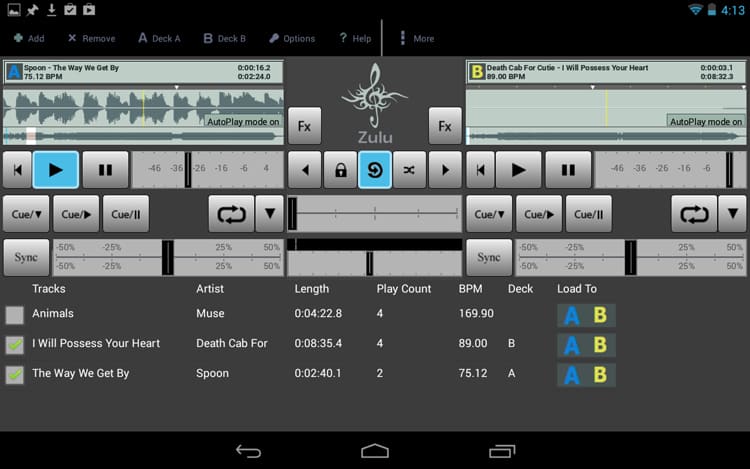 It comes with all the traditional DJ controls such as; scratch, nudge, pitch, bend, and EQ, as well as Sync which allows you to sync the tempo of the two tracks so that they fit together nicely.