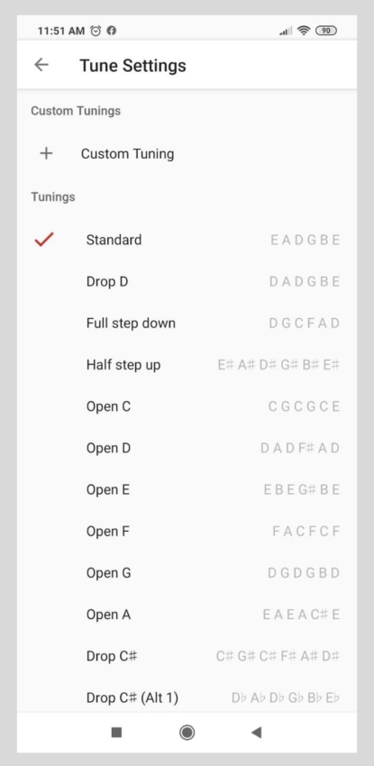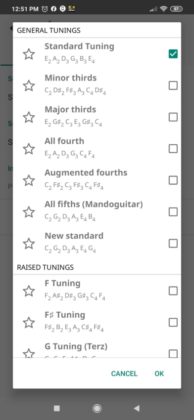 You can scroll through one of the largest selections of tuning configurations I’ve seen on any tuner app; like standard tuning, minor thirds, F tuning, G tuning, etc., and you can even save them as favorites for quick access later on.