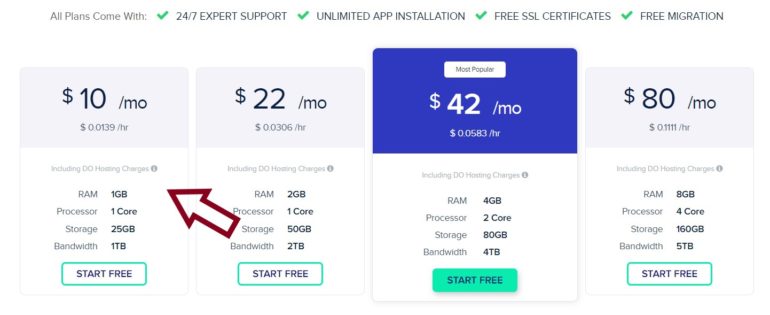 The cheapest plan costs $10 a month and you get 1GB of RAM, a 1Core Processor, 25GB of storage and 1TB worth of bandwidth.