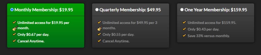 As far as pricing goes, you can sign up to the monthly membership for $19.95, the quarterly membership for $49.95, or the yearly membership for $159.95.