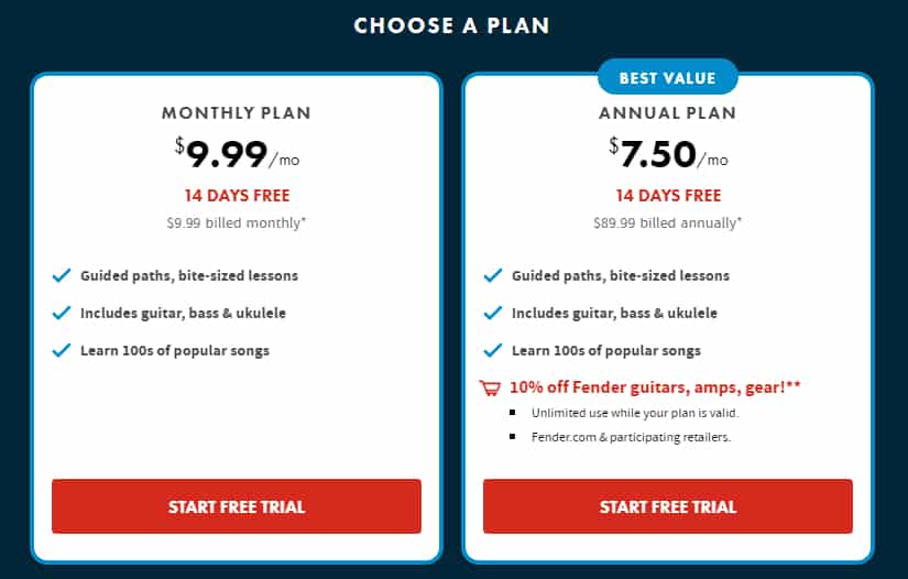 Just like most of the websites on this list, Fender Play also offers a 14-day free trial.