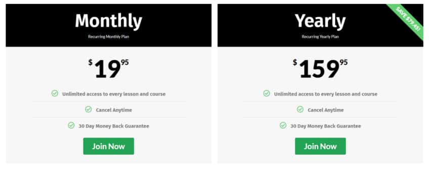 In terms of pricing, you have two options: Pay monthly or yearly. The monthly subscription costs $29 and the yearly subscription is $249, although they constantly promote it on their site for $179.99, so the yearly subscription is definitely the way to go if you plan on going through multiple courses.