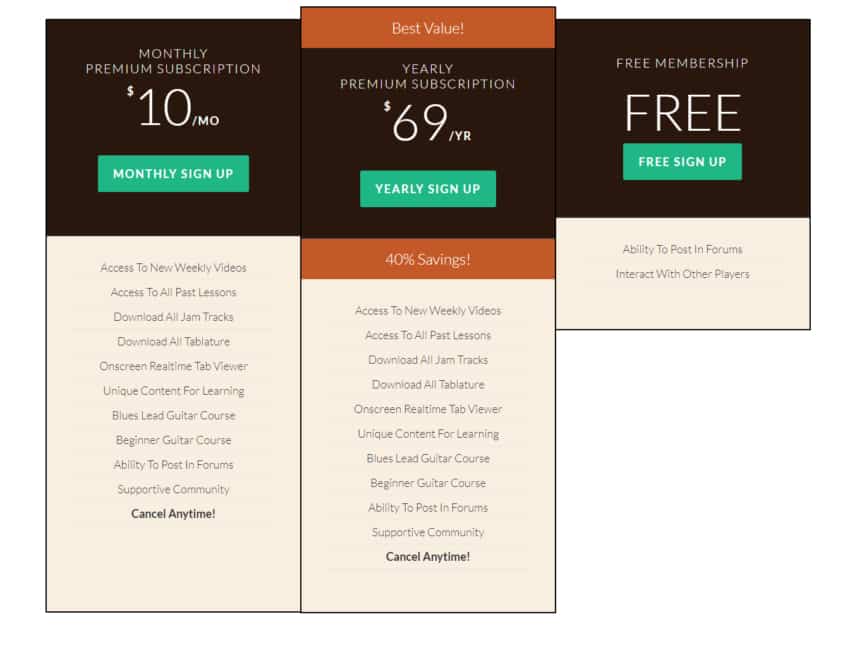 The benefits of signing up for the premium membership are that you will get access to over 35 courses, as well as monthly quick lick lessons, you will be able to download all the tabs available on the site, have forum access, as well as have access to new monthly courses.
