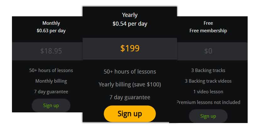 However, you can at least try out some of the content with the free signup, which provides you with three free backing tracks and backing track videos, as well as one free lesson.