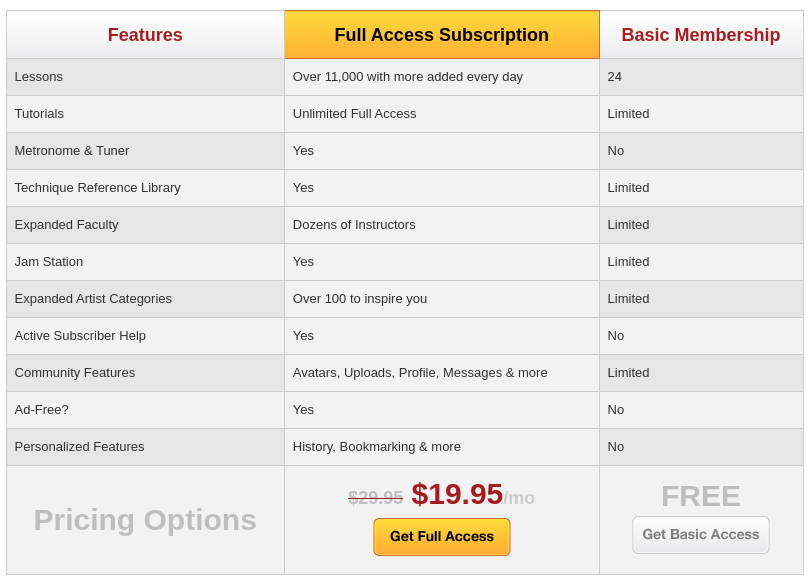 The free plan lets you try 24 sample lessons from 12 instructors only, while the full access features over 11.000 guitar lessons, 1.000 song lessons, and 45 instructors.