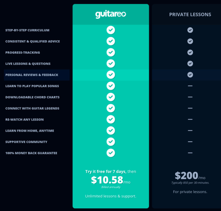 | Guitareo | $10.58 up to $200 | Beginner / Intermediate | Yes | Yes |