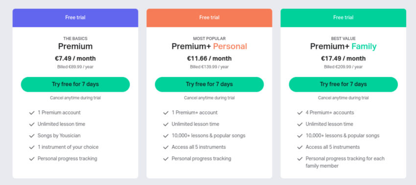 As far as pricing goes, Yousician offers three distinct plans: The Premium, Premium+Personal, and Premium+Family plans, and you can pay for them annually ($90, $139, and $210 per year respectively), or monthly ($20, $30, and $45 per month respectively).